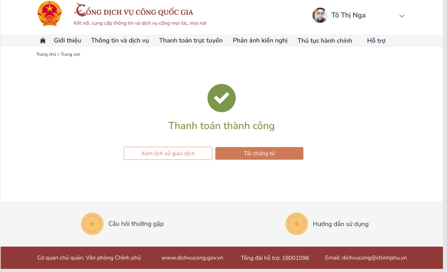 Thanh toán thành công, hiển thị màn hình thông báo thành công, người dùng có thể xem và tải biên lai trên Cổng Dịch vụ công Quốc gia trong Thông tin tài khoản.