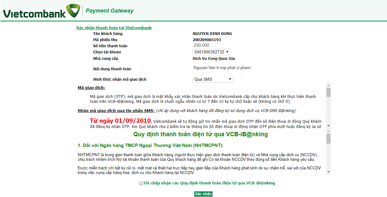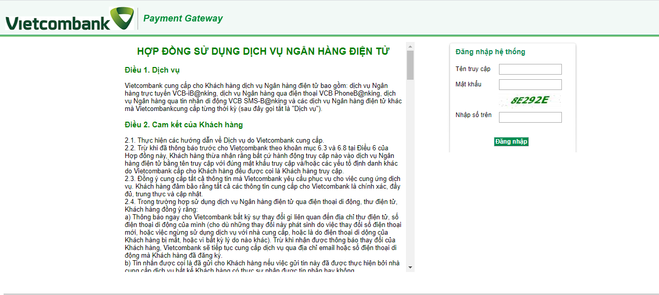 Ví dụ người dùng chọn thanh toán qua Ngân hàng Vietcombank (VCB), hệ thống điều hướng sang trang Ibanking của VCB như sau: