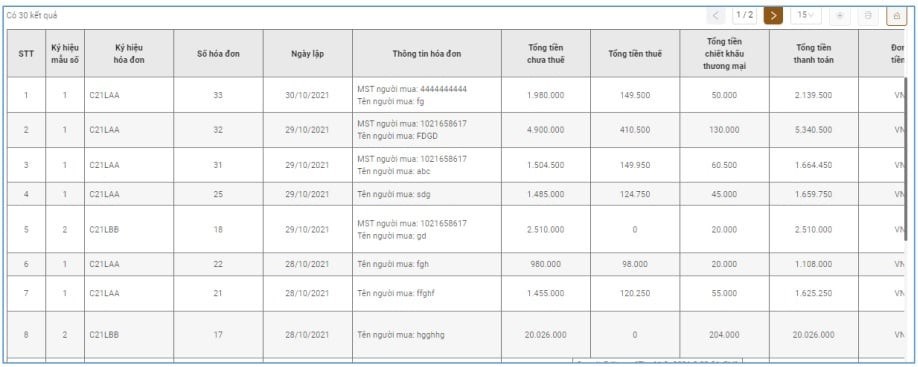 Sau khi thực hiện thao tác tìm kiếm, các hóa đơn thỏa mãn điều kiện tìm kiếm sẽ hiển thị trong danh sách hóa đơn điện tử bán ra.