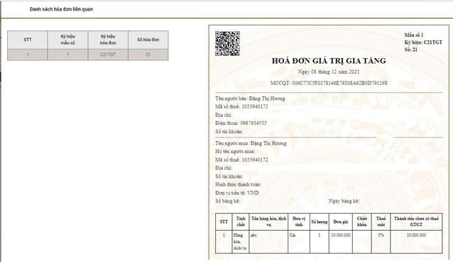 Với các hóa đơn thay thế, hóa đơn bị thay thế, hóa đơn điều chỉnh và hóa đơn bị điều chỉnh, người dùng có thể xem được hóa đơn liên quan với hóa đơn đã chọn bằng cách nhấn Xem danh sách hoá đơn tại cột Hóa đơn liên quan.