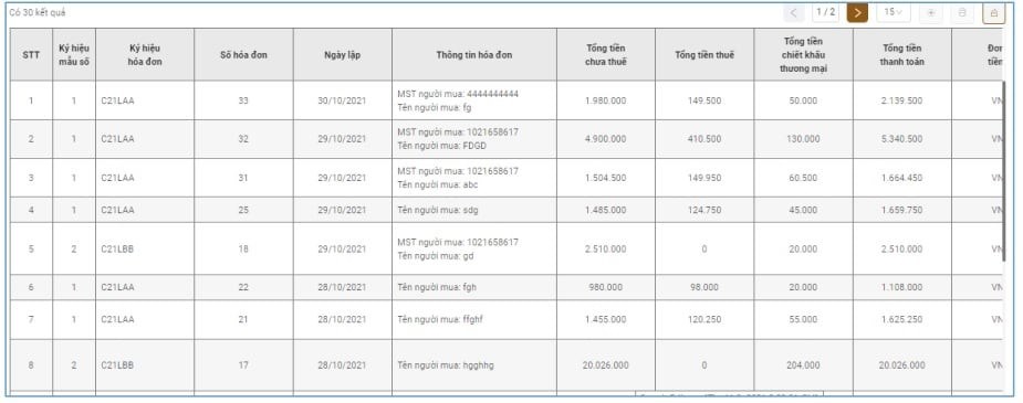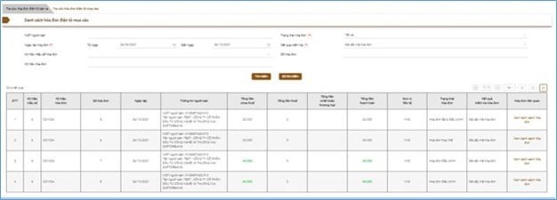 Sau khi thực hiện thao tác tìm kiếm, các hóa đơn thỏa mãn điều kiện tìm kiếm sẽ hiển thị trong danh sách hóa đơn điện tử mua vào.