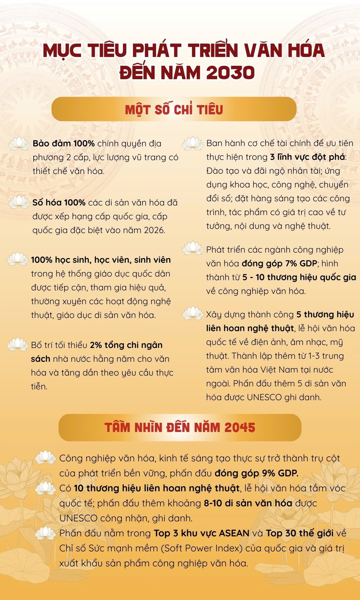 Đẩy mạnh xây dựng và phát triển nền văn hóa Việt Nam tiên tiến, đậm đà bản sắc dân tộc; thống nhất trong đa dạng; mang đặc trưng dân tộc, dân chủ, nhân văn, khoa học, hiện đại. Xây dựng môi trường văn hóa lành mạnh từ gia đình, nhà trường đến xã hội và không gian số. Phát triển văn học, nghệ thuật xứng tầm với lịch sử văn hóa dân tộc và tầm vóc đất nước trong kỷ nguyên mới. Cơ bản hoàn thành việc tu bổ, tôn tạo các di tích quốc gia đặc biệt; phục hồi, bảo tồn di sản văn hóa phi vật thể, nghệ thuật truyền thống có nguy cơ mai một, cần bảo vệ khẩn cấp. Đẩy mạnh phát triển các ngành công nghiệp văn hóa; hình thành hệ sinh thái khởi nghiệp công nghiệp văn hóa, nghệ thuật sáng tạo. Xây dựng một số tập đoàn công nghiệp văn hóa, cụm, khu công nghiệp sáng tạo, tổ hợp sáng tạo văn hóa tầm cỡ quốc tế dựa trên nền tảng công nghệ cao và các mô hình kinh doanh đổi mới sáng tạo. Chủ động, tích cực hội nhập quốc tế về văn hóa; xây dựng Việt Nam trở thành điểm đến hấp dẫn của các sự kiện văn hóa, nghệ thuật tầm cỡ khu vực và thế giới.