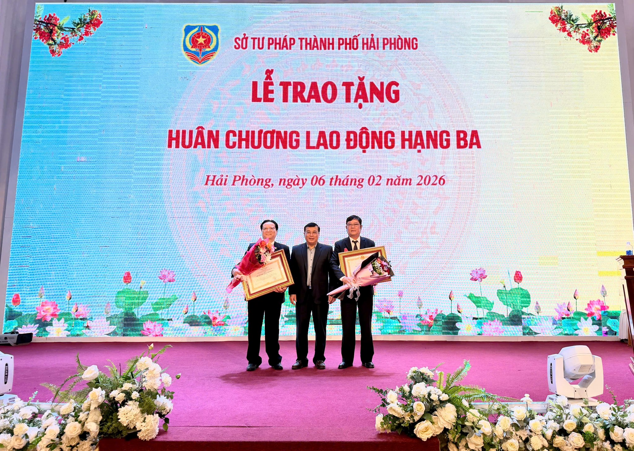 Trong không khí trang trọng và đầy ý nghĩa, Sở Tư pháp thành phố Hải Phòng đã long trọng tổ chức Lễ trao tặng Huân chương Lao động hạng Ba cho đồng chí Đoàn Quang Định và đồng chí Vũ Văn Tỉnh – nguyên Phó Giám đốc Sở Tư pháp. Đây là phần thưởng cao quý của Đảng và Nhà nước nhằm ghi nhận, biểu dương những đóng góp quan trọng, bền bỉ và trách nhiệm của hai đồng chí đối với sự nghiệp xây dựng, phát triển ngành Tư pháp thành phố Hải Phòng trong suốt quá trình công tác.