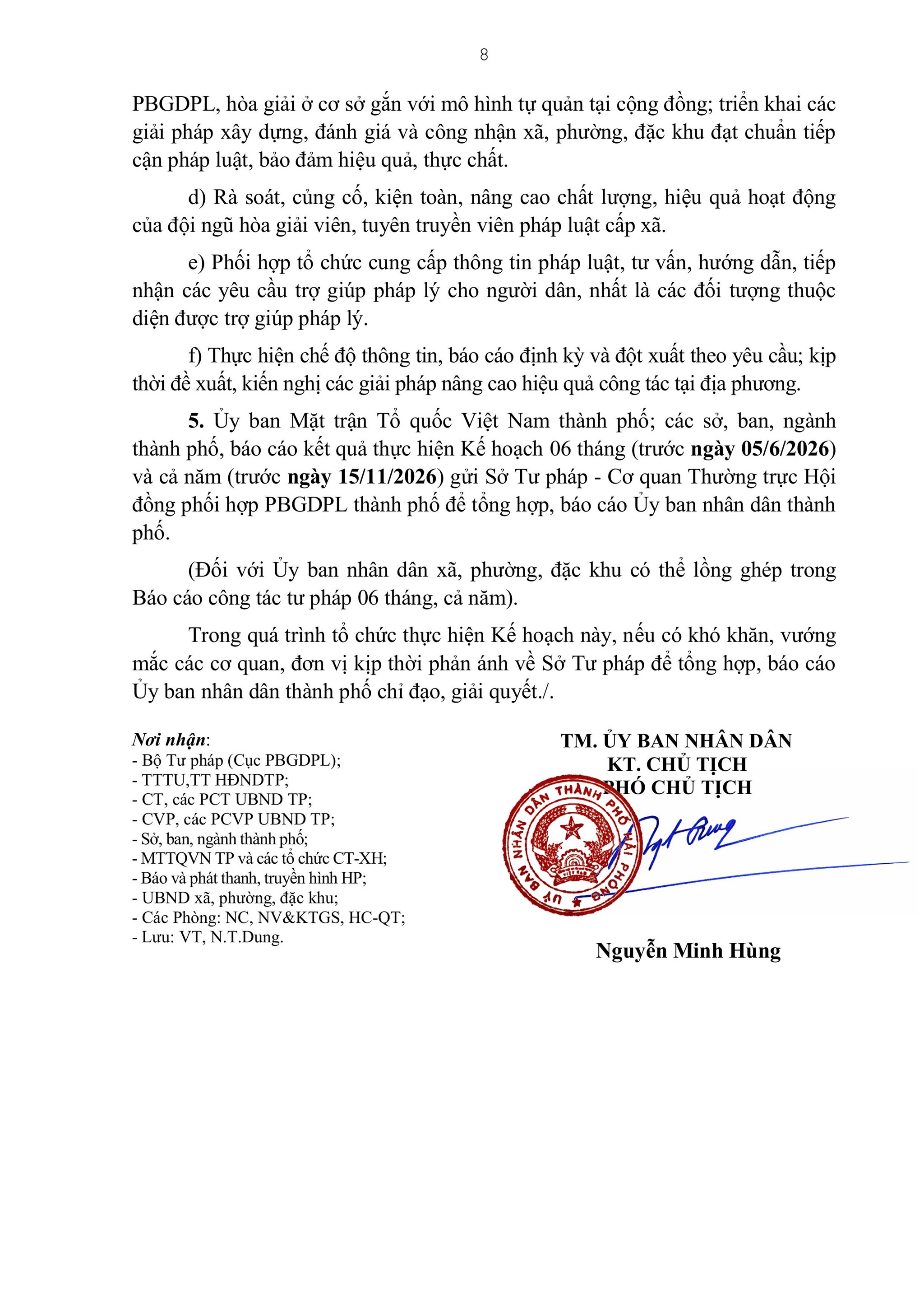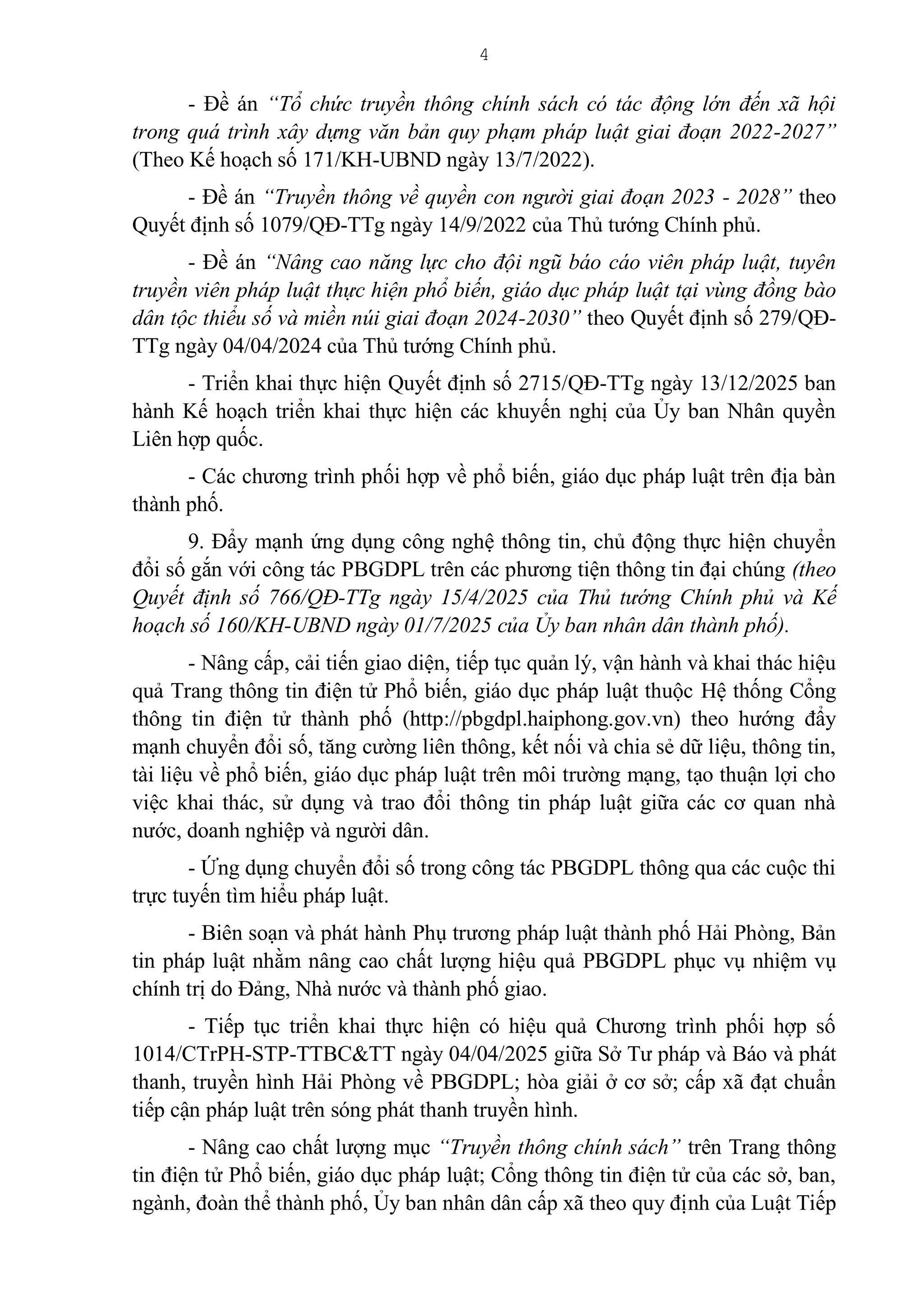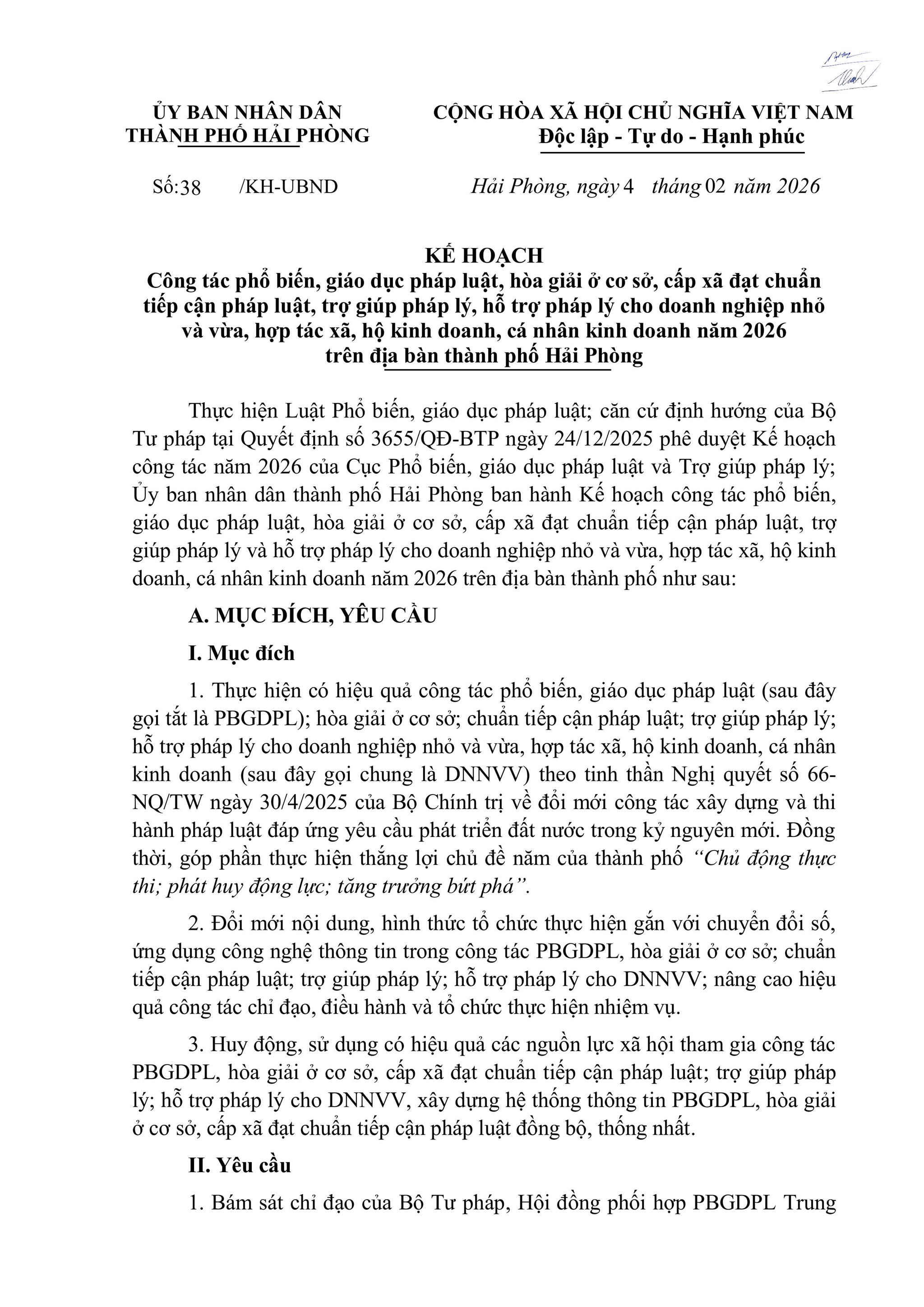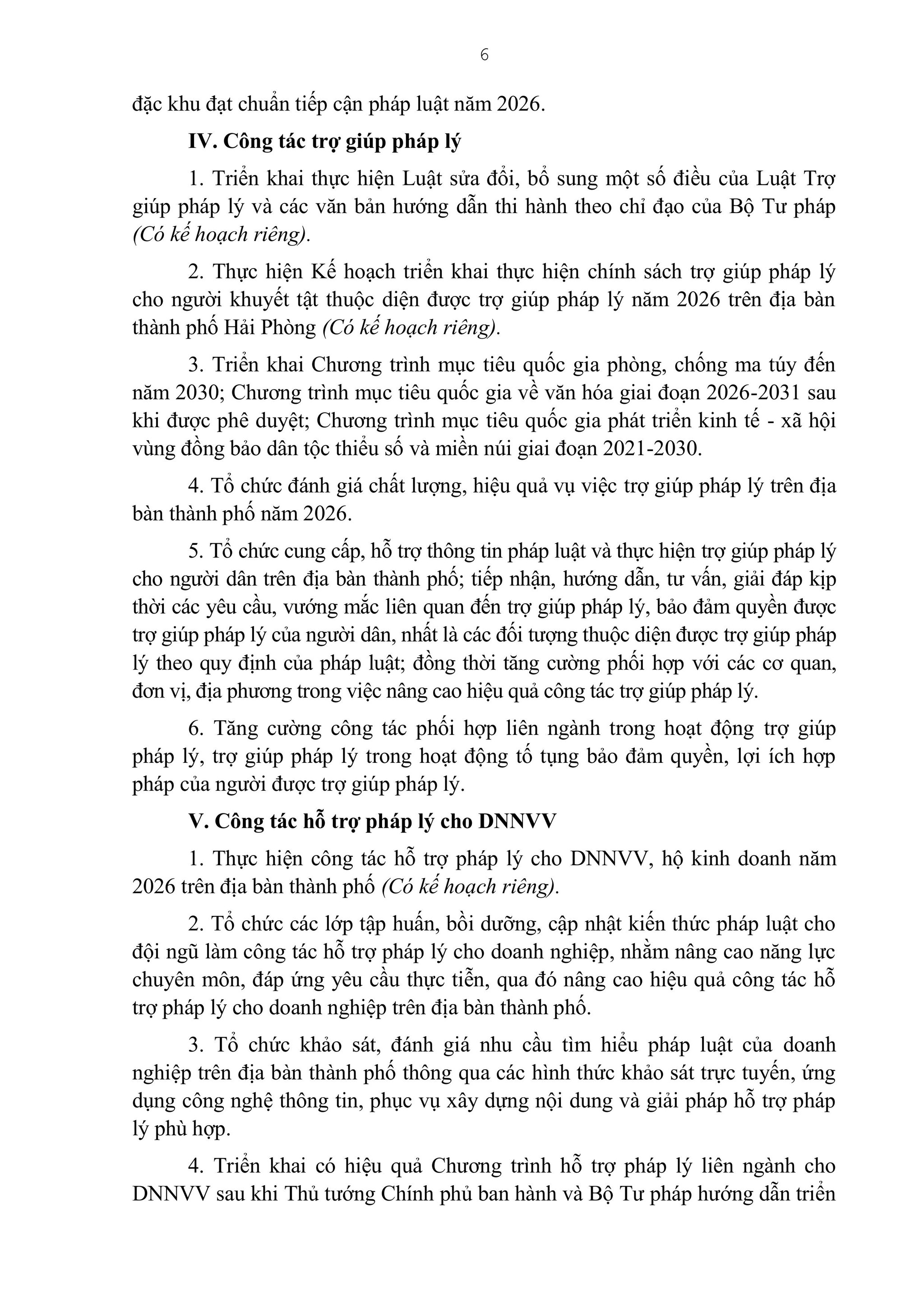 KẾ HOẠCH Công tác phổ biến, giáo dục pháp luật, hòa giải ở cơ sở, cấp xã đạt chuẩn tiếp cận pháp luật, trợ giúp pháp lý, hỗ trợ pháp lý cho doanh nghiệp nhỏ và vừa, hợp tác xã, hộ kinh doanh, cá nhân kinh doanh năm 2026 trên địa bàn thành phố Hải Phòng