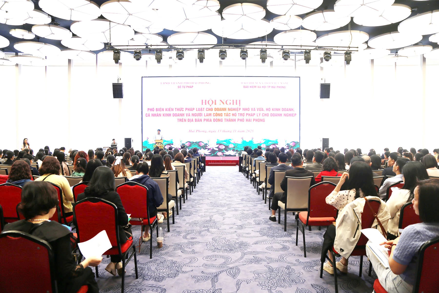 Sáng ngày 13/11/2025, tại Trung tâm Hội nghị biểu diễn thành phố Sở Tư pháp phối hợp với Bảo hiểm xã hội thành phố tổ chức Hội nghị phổ biến kiến thức pháp luật cho doanh nghiệp nhỏ và vừa, hộ kinh doanh, cá nhân kinh doanh và người làm công tác hỗ trợ pháp lý cho doanh nghiệp trên địa bàn phía Đông thành phố Hải Phòng với sự tham gia của đại diện Lãnh đạo các sở, ban, ngành thành phố và cán bộ đầu mối thực hiện công tác hỗ trợ pháp lý cho doanh nghiệp; đại diện các tổ chức Hội, Hiệp hội doanh nghiệp nhỏ và vừa thành phố; Liên minh hợp tác xã thành phố; Đoàn Luật sư, Hội Luật gia thành phố. Đặc biệt, Hội nghị còn có sự tham dự của đại diện hơn 500 Doanh nghiệp nhỏ và vừa trên địa bàn phía Đông thành phố.