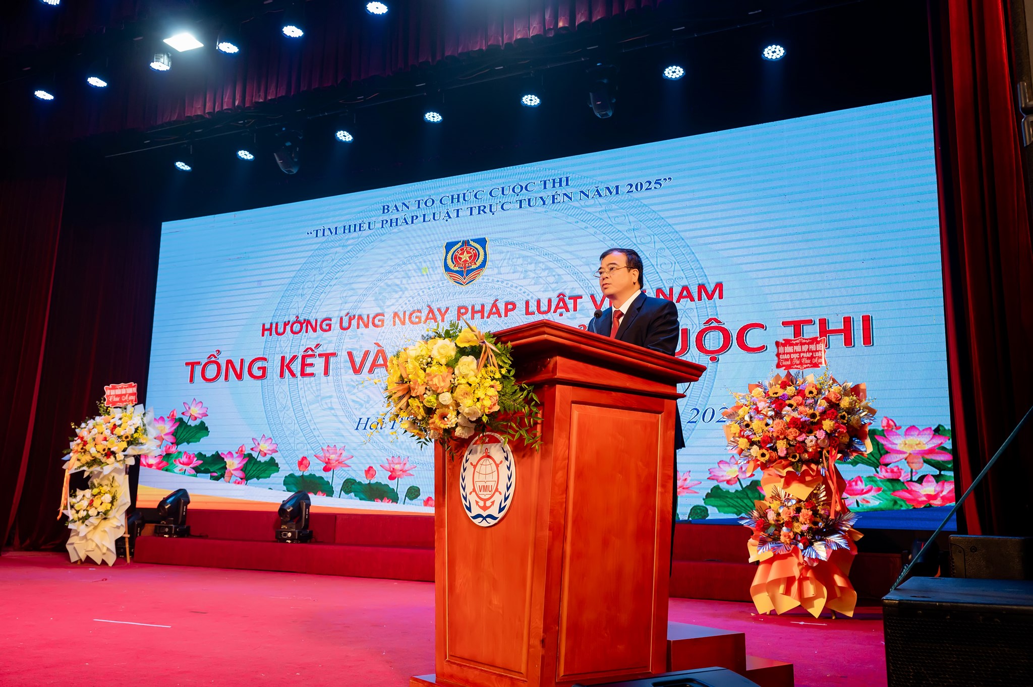 Đồng chí Nguyễn Minh Hùng, Ủy viên Thành ủy, Phó Chủ tịch UBND thành phố, Chủ tịch Hội đồng phối hợp PBGDPL thành phố phát biểu ghi nhận, biểu dương kết quả Cuộc thi và Hưởng ứng Ngày Pháp luật Việt Nam