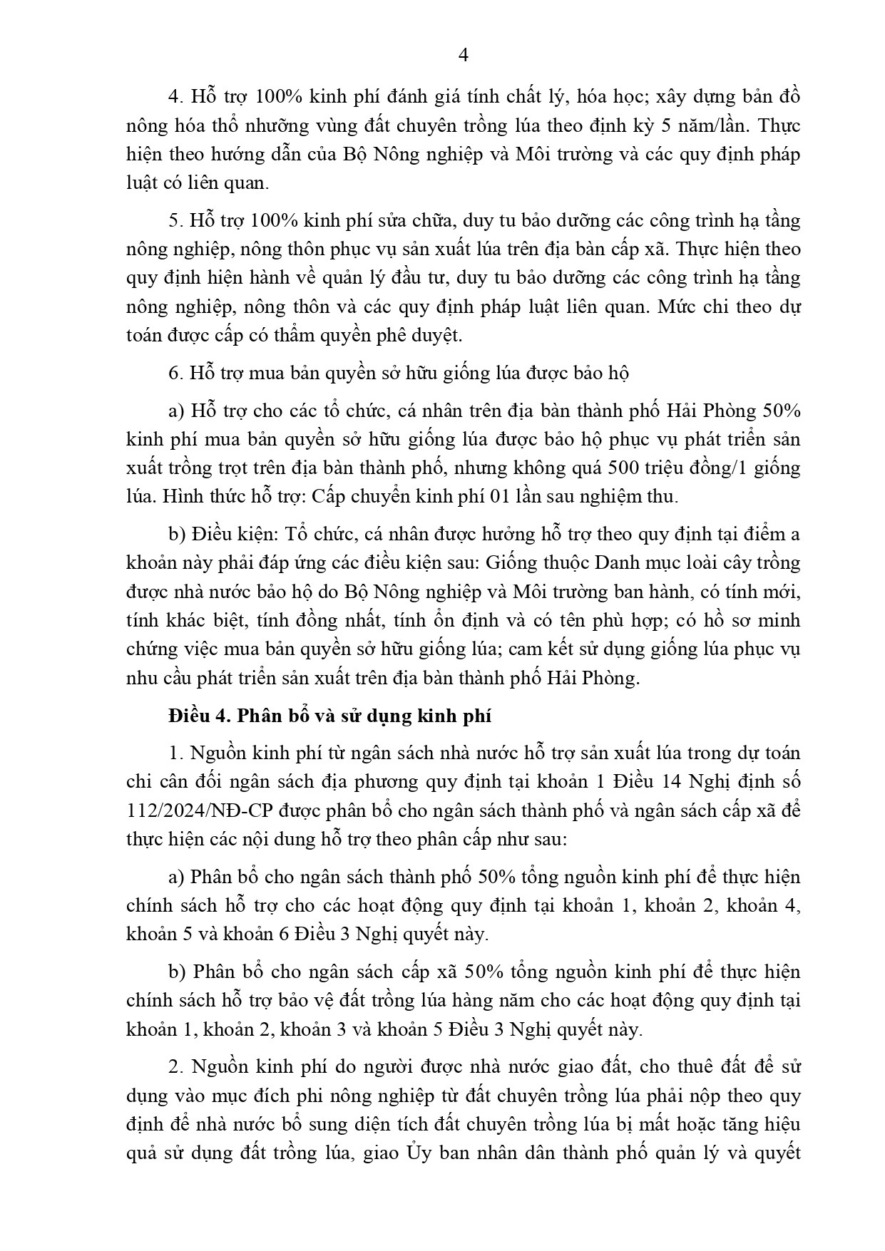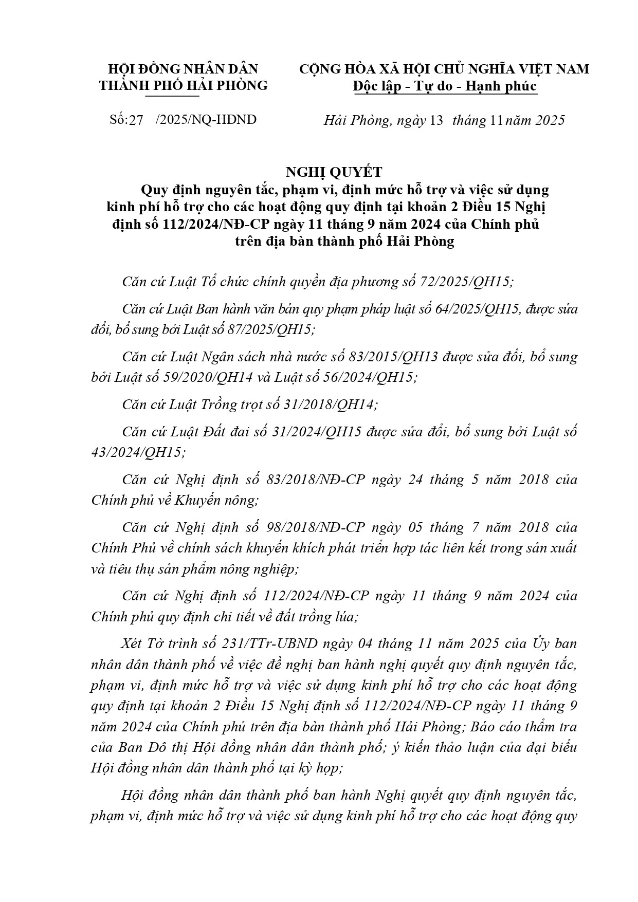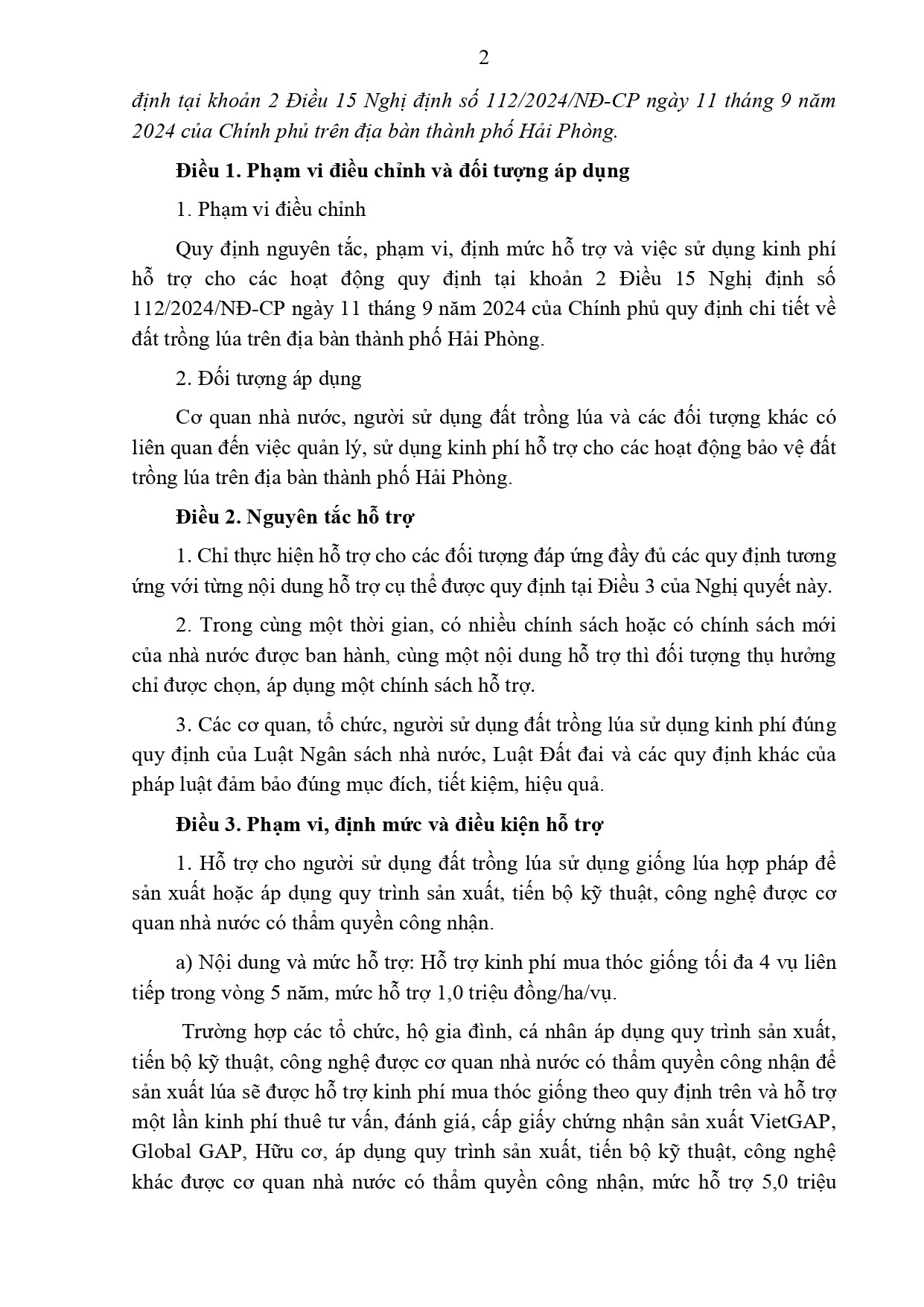 NGHỊ QUYẾT Quy định nguyên tắc, phạm vi, định mức hỗ trợ và việc sử dụng kinh phí hỗ trợ cho các hoạt động quy định tại khoản 2 Điều 15 Nghị định số 112/2024/NĐ-CP ngày 11 tháng 9 năm 2024 của Chính phủ trên địa bàn thành phố Hải Phòng