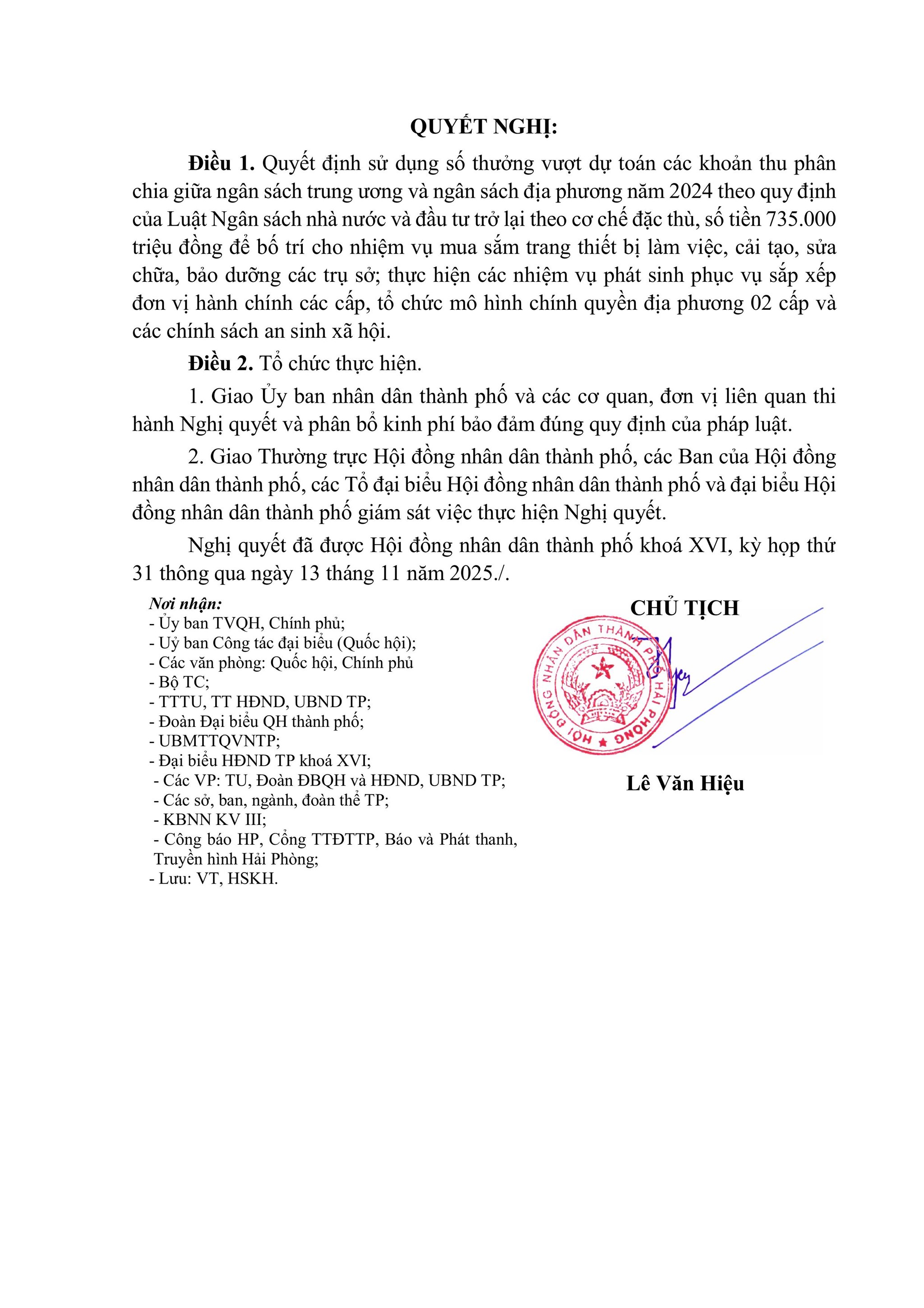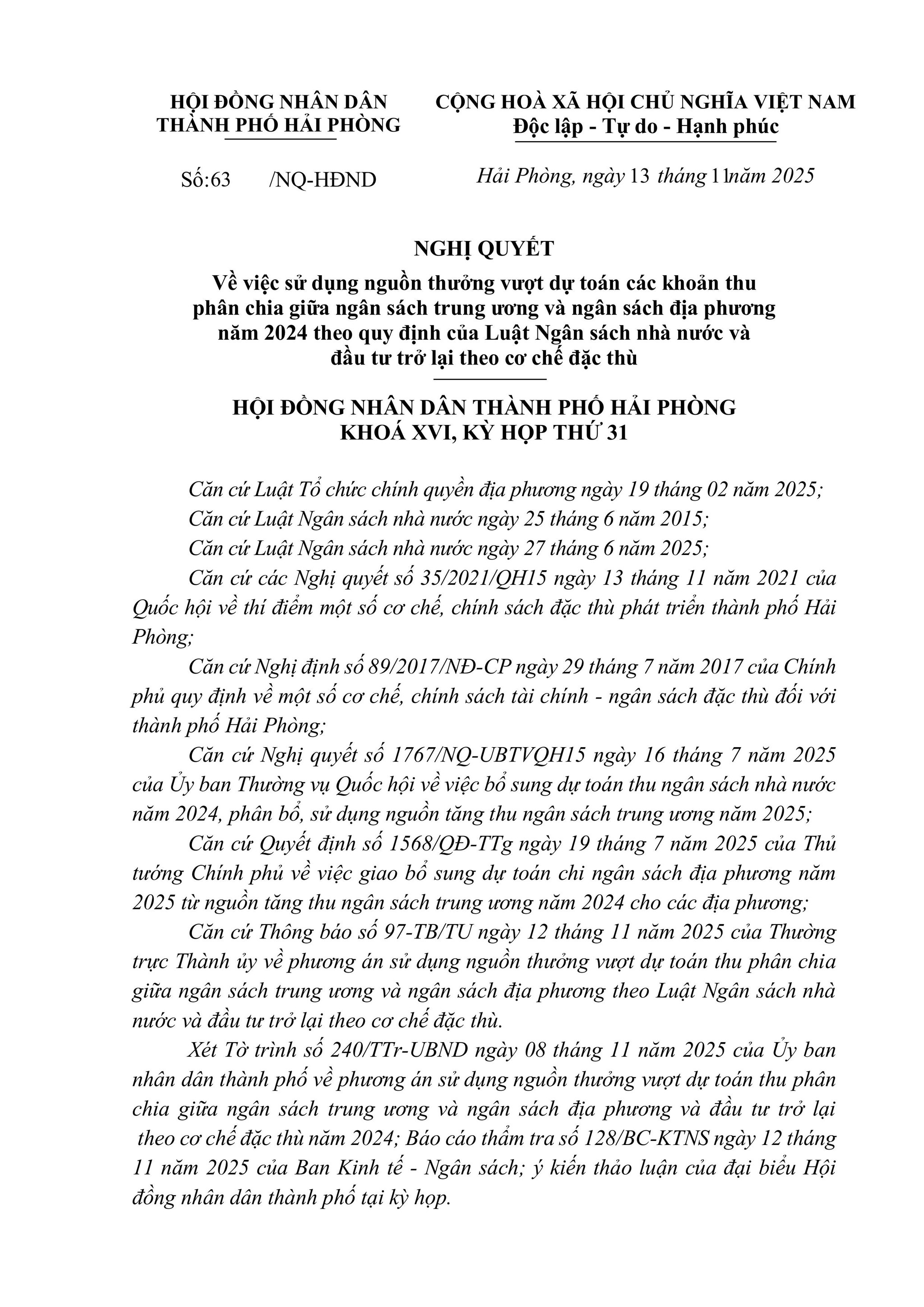 NGHỊ QUYẾT Về việc sử dụng nguồn thưởng vượt dự toán các khoản thu phân chia giữa ngân sách trung ương và ngân sách địa phương năm 2024 theo quy định của Luật Ngân sách nhà nước và đầu tư trở lại theo cơ chế đặc thù