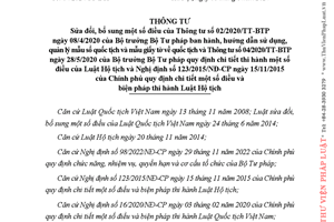 Thông tư 04/2024/TT-BTP sửa đổi Thông tư 02/2020/TT-BTP hướng dẫn sử dụng, quản lý mẫu sổ quốc tịch và mẫu giấy tờ về quốc tịch và Thông tư 04/2020/TT-BTP hướng dẫn Luật hộ tịch và Nghị định 123/2015/NĐ-CP hướng dẫn Luật hộ tịch.