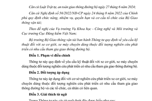 Thông tư 52/2024/TT-BGTVT ngày 15/11/2024 quy định về yêu cầu kỹ thuật đối với xe cơ giới, xe máy chuyên dùng thuộc đối tượng nghiên cứu phát triển có nhu cầu tham gia giao thông đường bộ do Bộ trưởng Bộ Giao thông vận tải ban hành