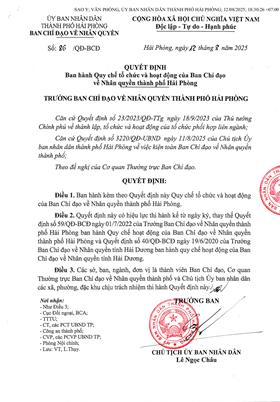Quyết định số 86/QĐ-BCĐ ngày 12/8/2025 của Ban chỉ đạo về nhân quyền thành phố về việc ban hành Quy chế tổ chức và hoạt động của Ban chỉ đạo về Nhân quyền thành phố Hải Phòng