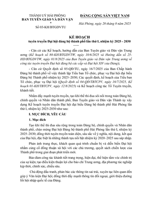 Kế hoạch số 03-KH/BTGDVTU ngày 20/8/2025 của Ban Tuyên giáo và Dân vận về tuyên truyền Đại hội Đảng bộ thành phố lần thứ I, nhiệm kỳ 2025-2030