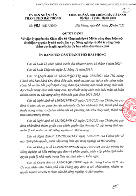 Quyết định số 3921/QĐ-UBND ngày 01/10/2025 của Ủy ban nhân dân thành phố về việc ủy quyền cho Giám đốc Sở Nông nghiệp và Môi trường thực hiện một số nhiệm vụ quản lý nhà nước lĩnh vực Nông nghiệp và Môi trường thuộc thẩm quyền giải quyết của Ủy ban nhân dân thành phối