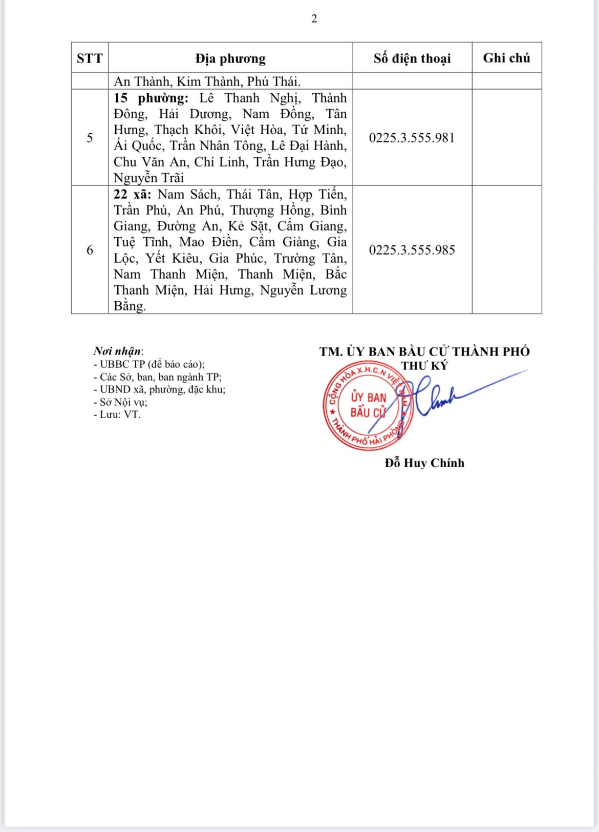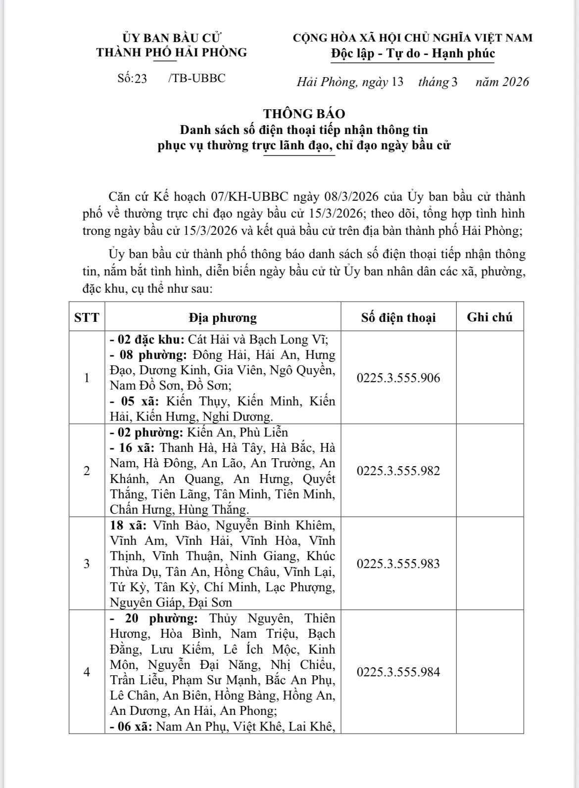 Danh sách số điện thoại tiếp nhận thông tin phục vụ thường trực lãnh đạo, chỉ đạo ngày bầu cử
