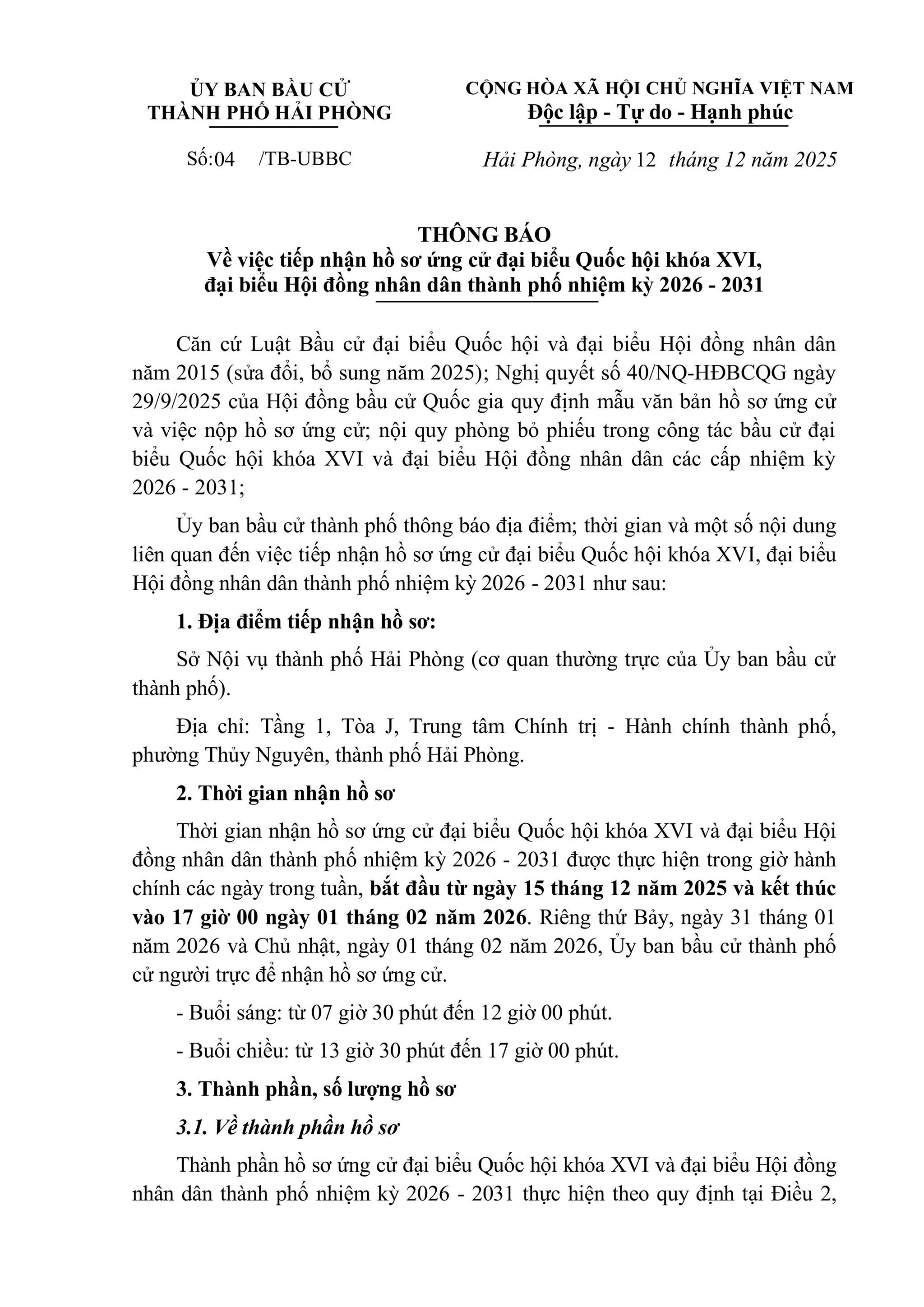 THÔNG BÁO: Về việc tiếp nhận hồ sơ ứng cử đại biểu Quốc hội khóa XVI, đại biểu Hội đồng nhân dân thành phố nhiệm kỳ 2026 - 2031
