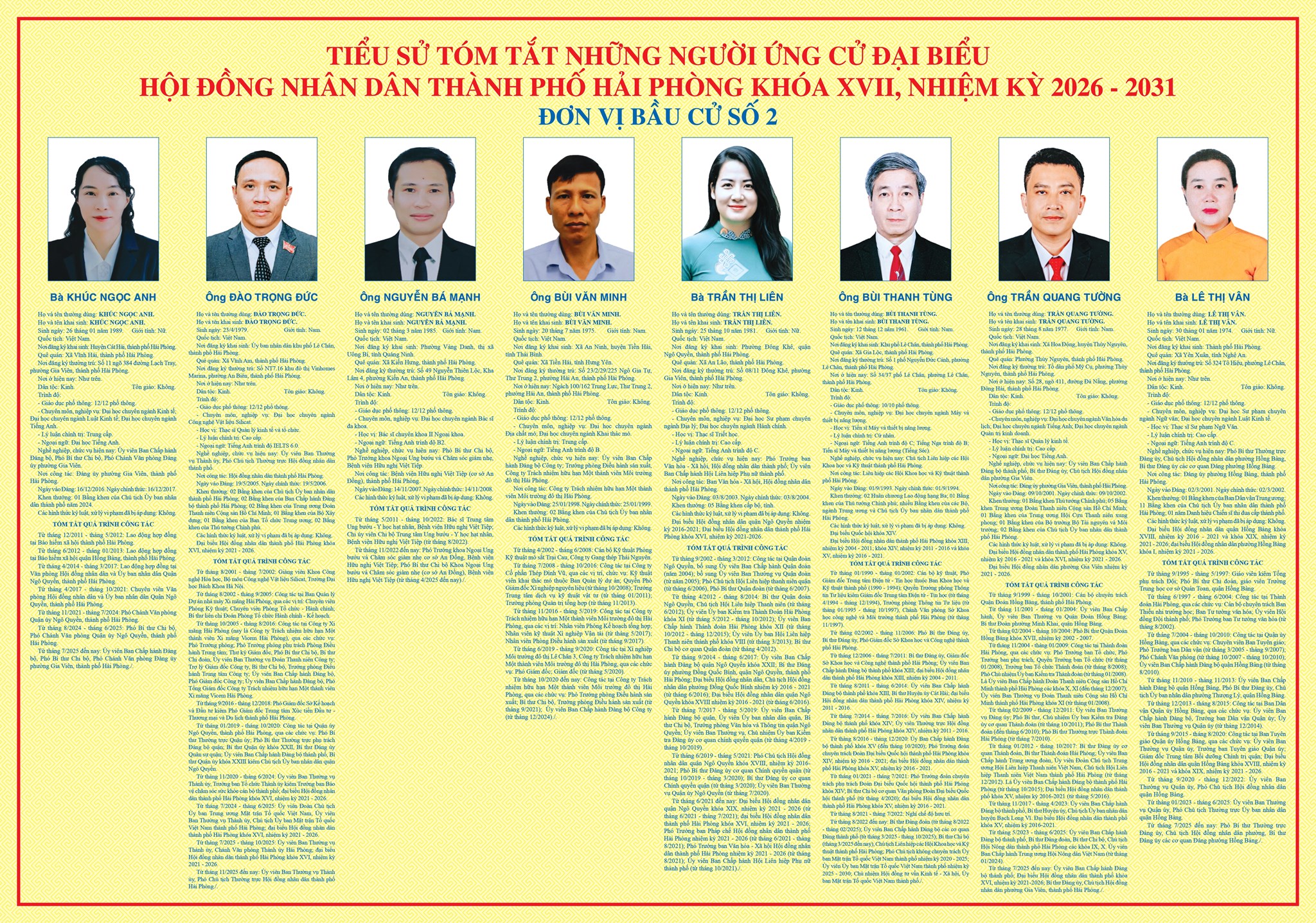 TIỂU SỬ TÓM TẮT NHỮNG NGƯỜI ỨNG CỬ ĐẠI BIỂU HĐND THÀNH PHỐ HẢI PHÒNG KHÓA XVII, NHIỆM KỲ 2026-2031 - ĐƠN VỊ BẦU CỬ SỐ 2