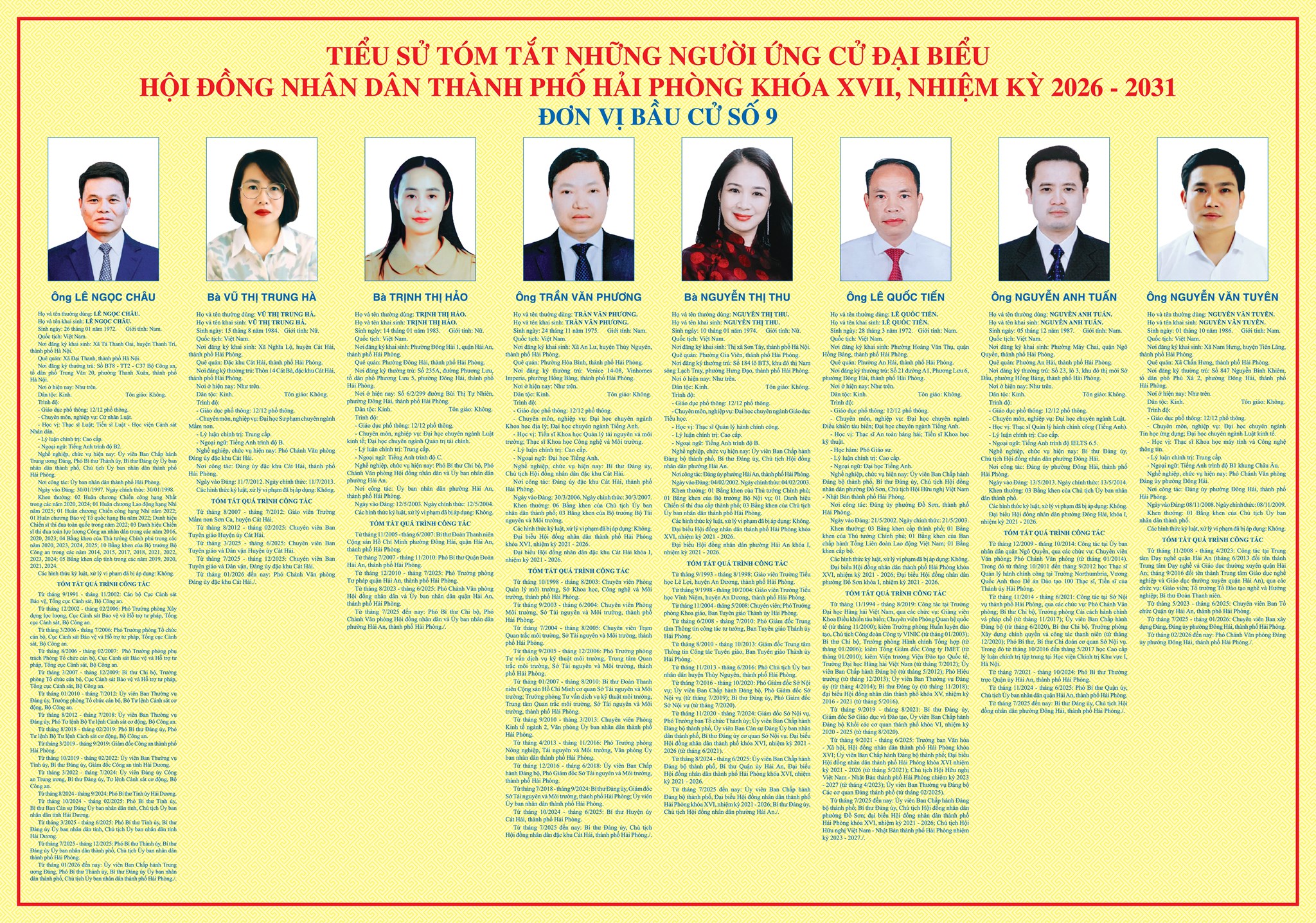 TIỂU SỬ TÓM TẮT NHỮNG NGƯỜI ỨNG CỬ ĐẠI BIỂU HỘI ĐỒNG NHÂN DÂN THÀNH PHỐ HẢI PHÒNG KHÓA XVII, NHIỆM KỲ 2026-2031, ĐƠN VỊ BẦU CỬ SỐ 9