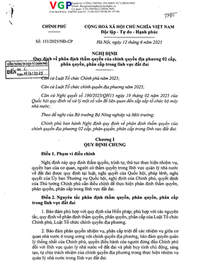 Nghị định số 151/2025/NĐ-CP của Chính phủ: Quy định về phân định thẩm quyền của chính quyền địa phương 02 cấp, phân quyền, phân cấp trong lĩnh vực đất đai