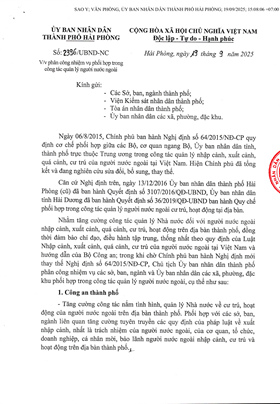 Văn bản số 2396/UBND-NC ngày 19/9/2025 của Ủy ban nhân dân thành phố về việc phân công nhiệm vụ phối hợp trong công tác quản lý người nước ngoài