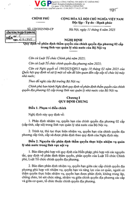 Nghị định số 129/2025/NĐ-CP của Chính phủ: Quy định về phân định thẩm quyền của chính quyền địa phương 02 cấp trong lĩnh vực quản lý nhà nước của Bộ Nội vụ