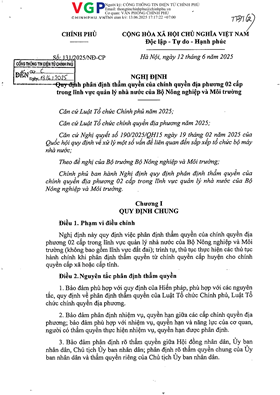 Nghị định số 131/2025/NĐ-CP của Chính phủ: Quy định phân định thẩm quyền của chính quyền địa phương 02 cấp trong lĩnh vực quản lý nhà nước của Bộ Nông nghiệp và Môi trường