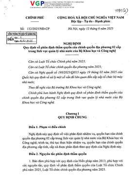 Nghị định số 132/2025/NĐ-CP của Chính phủ: Quy định về phân định thẩm quyền của chính quyền địa phương 02 cấp trong lĩnh vực quản lý nhà nước của Bộ Khoa học và Công nghệ