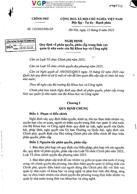 Nghị định số 133/2025/NĐ-CP của Chính phủ: Quy định về phân quyền, phân cấp trong lĩnh vực quản lý nhà nước của Bộ Khoa học và Công nghệ