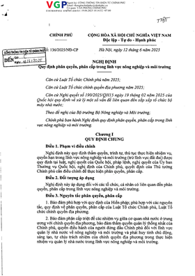 Nghị định số 136/2025/NĐ-CP của Chính phủ: Quy định phân quyền, phân cấp trong lĩnh vực nông nghiệp và môi trường