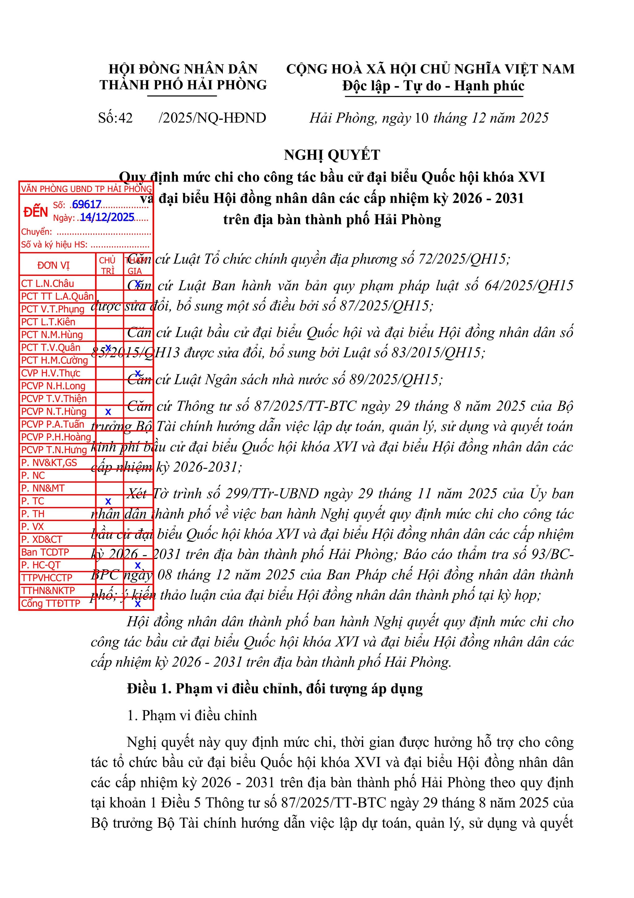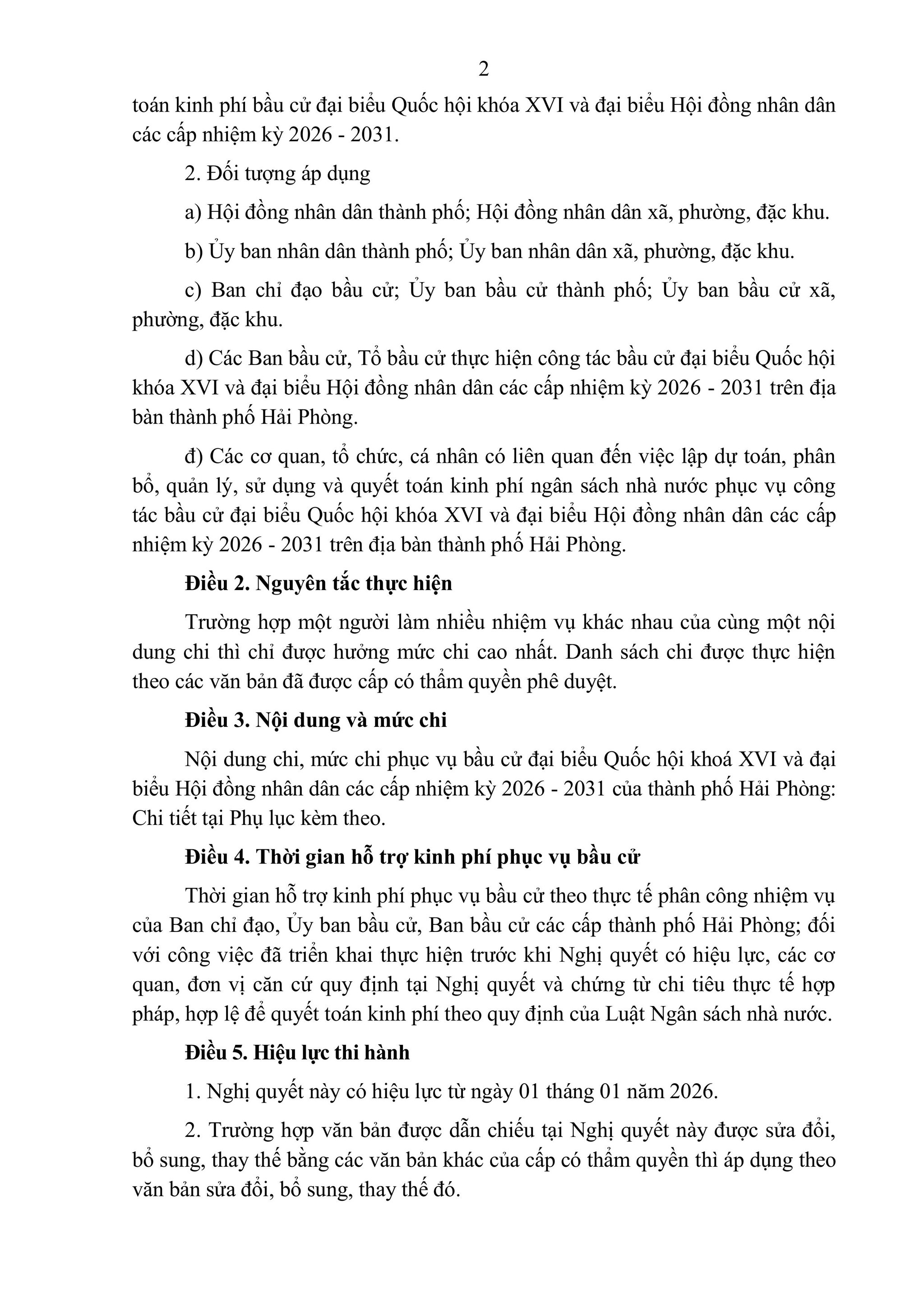 Quy định mức chi cho công tác bầu cử đại biểu Quốc hội khóa XVI và đại biểu Hội đồng nhân dân các cấp nhiệm kỳ 2026 - 2031 trên địa bàn thành phố Hải Phòng