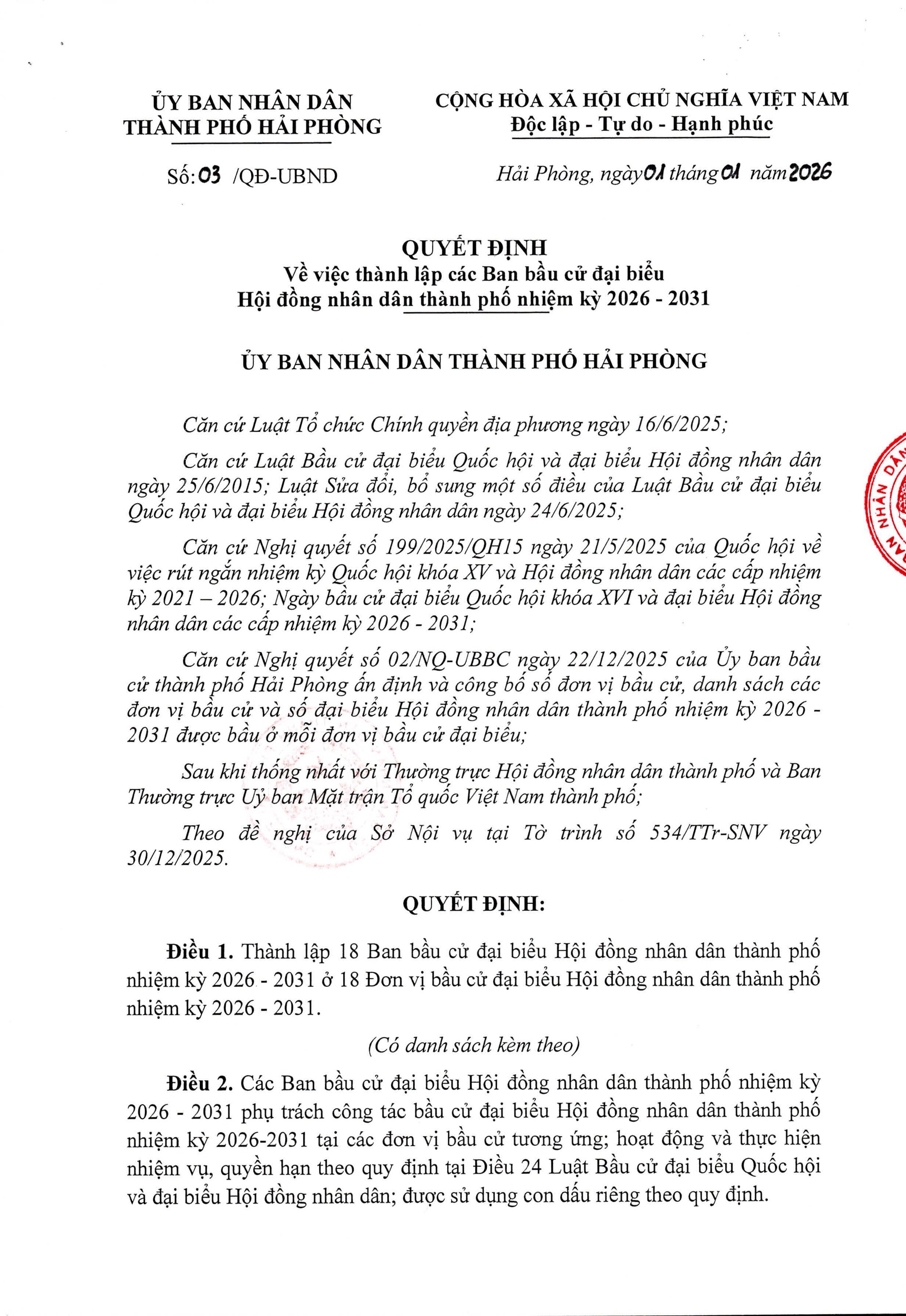 Nghị quyết Ấn định và công bố số đơn vị bầu cử, danh sách các đơn vị bầu cử và số lượng đại biểu được bầu ở mỗi đơn vị bầu cử đại biểu Hội đồng nhân dân thành phố Hải Phòng nhiệm kỳ 2026 - 2031